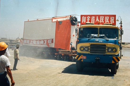 上安电厂——在泛黄的老照片里,一条蜿蜒曲折的土路上,一辆老式大卡车正缓缓前行,车头上“向全省人民致敬”、集装箱上“保证上安重点工程”的标语引人注目。车旁,手持对讲机的警察、戴着安全帽的工人,无不显示着上安电厂项目的重要性。
